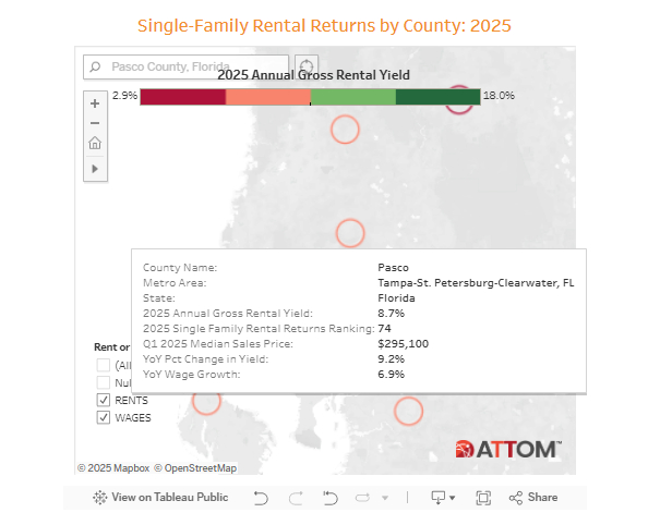 Pasco County: Offers relatively affordable home prices compared to neighboring counties, making it an attractive option for investors seeking higher rental yields. SFR here has a median home price of $295,100 with a gross rental yield of 8.75%.