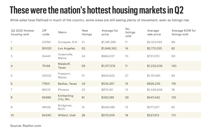 ZIP code 03782 in Sunapee, New Hampshire, was the nation's hottest housing market for the quarter. In the past five years, sales-price momentum surged 262% in that ZIP code. The average list price for the first quarter was $1,185,296, while the average sale price was $2,123,045.