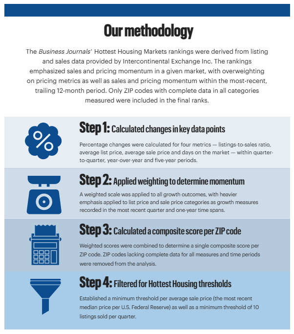 The rankings are based on data from Intercontinental Exchange Inc. and are intended to emphasize sales and pricing momentum in each ZIP code. They use a weighted formula that includes quarterly and year-over-year data and only includes ZIP codes with an average sale price of $422,800, which is the median sale price nationally, according to the Federal Reserve at the end of May.