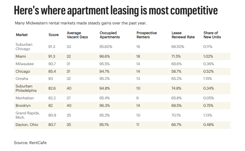 That's according to a recent analysis by real estate market insight company RentCafe, which provides a competitiveness score that includes occupancy rates, lease renewals and number of prospective renters, among other factors.
