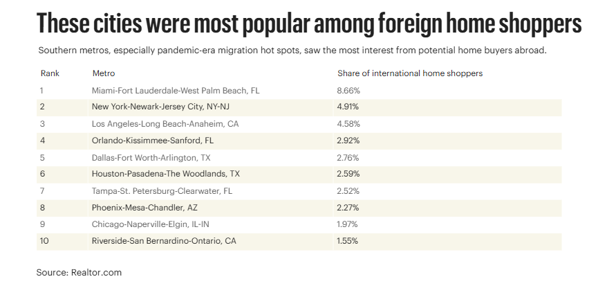 Sun Belt metros that saw tremendous pandemic-era in-migration — which often resulted in an influx of wealthier residents to those areas — are also hot with international home shoppers.