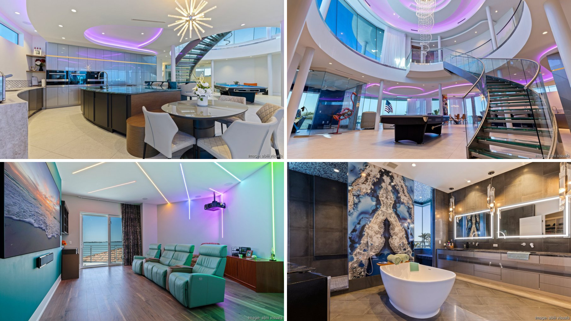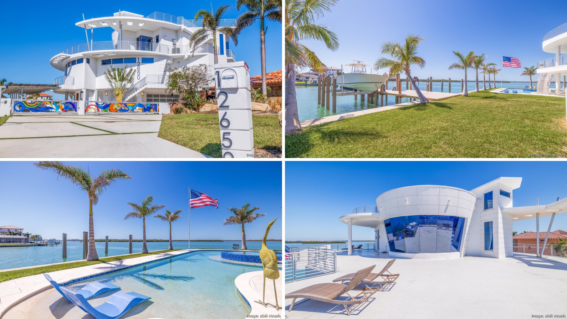 Multiple curving balconies, a circular roof deck and floor-to-ceiling impact-rated glass offer views of the gulf, and the private dock provides gulf access via Boca Ciega Bay.